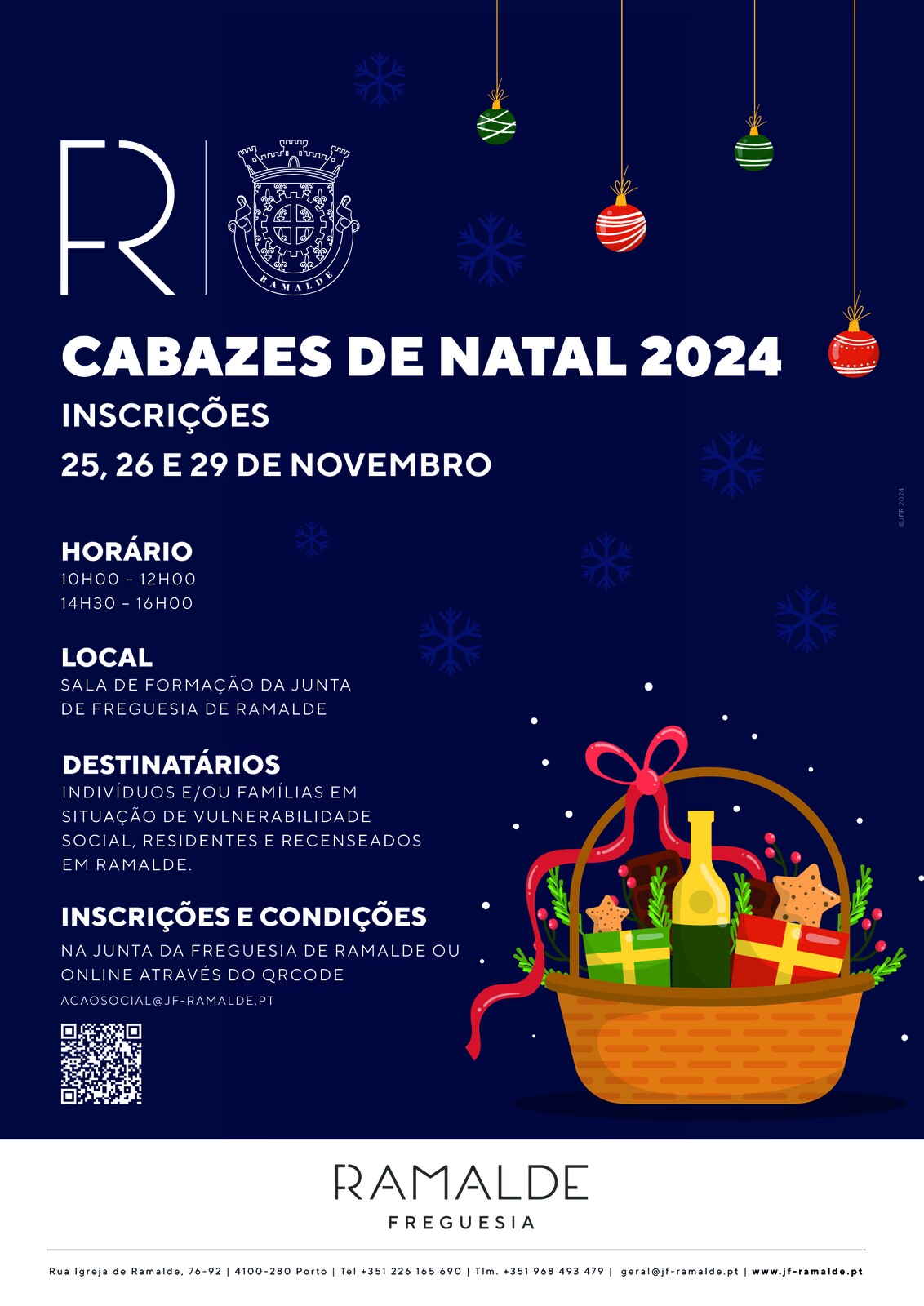 A Junta de Freguesia de Ramalde informa que nos dias 25, 26 e 29 de novembro estarão abertas as inscrições para os Cabazes de Natal 2024, um apoio destinado a famílias em situação de vulnerabilidade socioeconómica, residentes e recenseadas na nossa Freguesia.